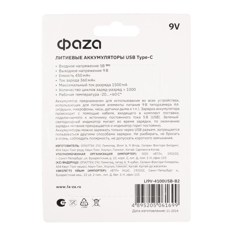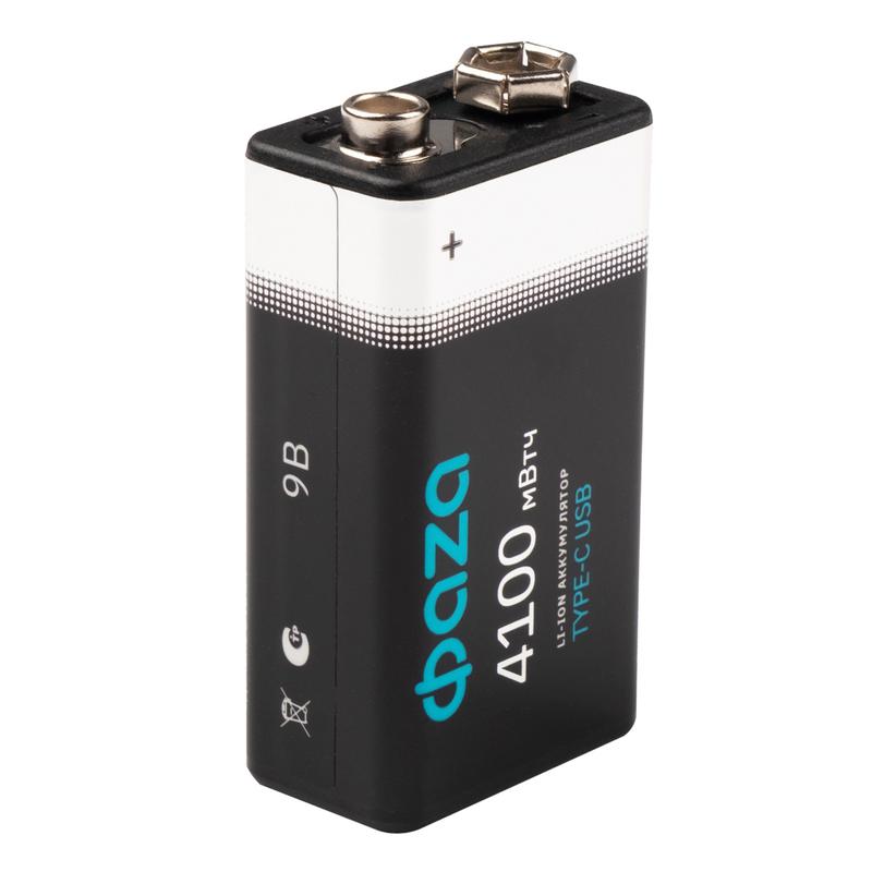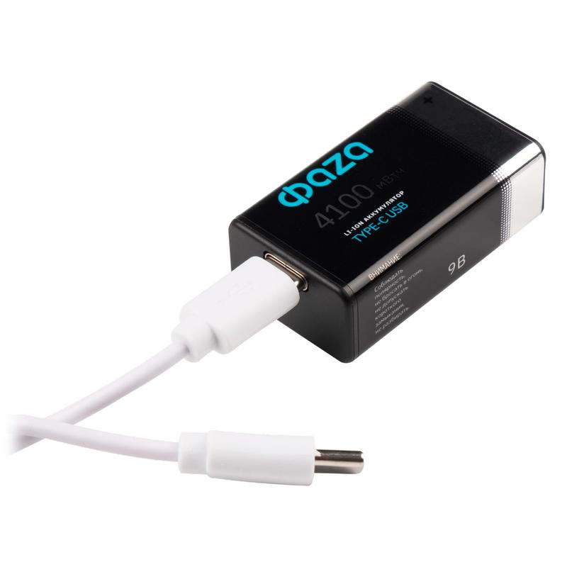 Аккумулятор литиевый "крона" 9В Li-Ion 4100мВт.ч 455мА.ч зарядка от Type-C шнур в комплекте BL-2 (уп.2шт) ФАZА 5061699
