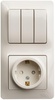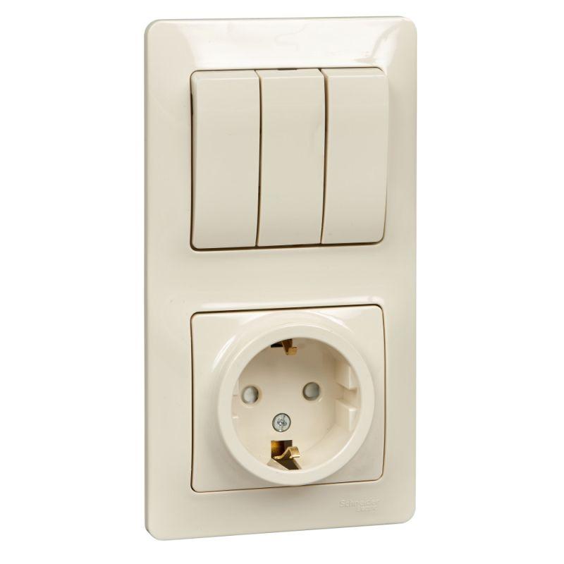 Блок комбинированный Systeme Electric (ранее Schneider Electric) серии Glossa (в сборе, цвет бежевый) предназначен для сетей до 250 В, состоит из розетки с заземлением и шторками на 16 А и 3-клавишного выключателя на 10 А. - Блок удобен в применении и отлично подходит для коридора. - Заземляющий контакт обеспечивает дополнительную защиту от удара электрическим током. При наличии заземления электрический потенциал уходит в землю, защищая человека. - Трёхклавишный выключатель позволяет управлять тремя источниками света из одной точки. - Выполнен из материала PС+ASA, стойкого к УФ-излучению и появлению царапин.