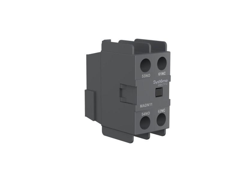 Блок дополнительных контактов для контакторов серии SystemePact MC1D; конфигурация 1НО + 1НЗ; фронтальный монтаж с помощью винтовых зажимов. Блоки дополнительных контактов применяются совместно с контакторами и предназначены для увеличения количества вспомогательных контактов, использующихся в цепях сигнализации и управления.