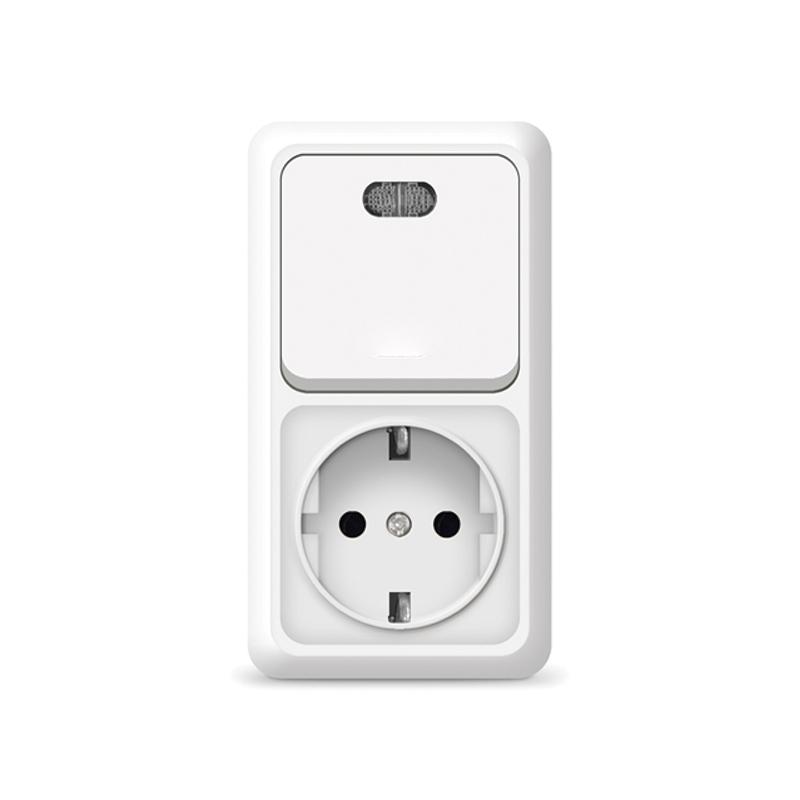 Блок ОП Олимп 1-кл. вык. с подсветкой + роз. с заземл. верт. бел. UNIVersal О0039 представлен потребителю в серии "Олимп". Серия "Олимп" для открытой установки сочетает в себе функциональность с практичностью. Изделия данной серии удачно вписываются в интерьер любого помещения и производят приятное впечатление. Блок объединяет одноклавишный выключатель и розетку. Корпус представляет собой форму из пластика, белого цвета. Контактная группа изделий изготовлена из латуни. Монтируется вертикально, на глубину 48 мм, на поверхность стены. Рекомендованы для жилых помещений и административных зданий. Срок службы составляет 5 000 циклов включения/отключения.