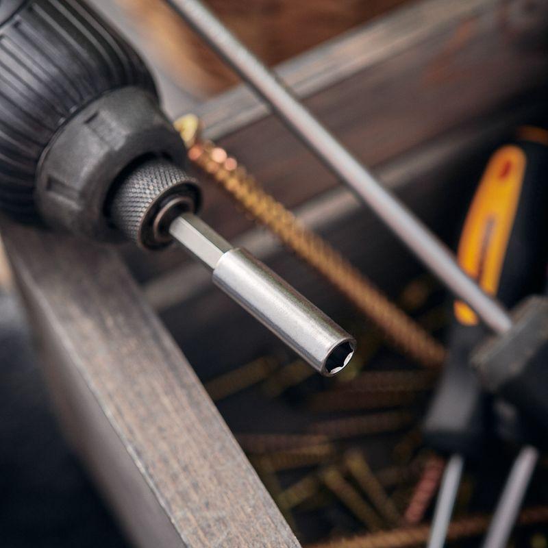 Магнитный держатель для бит предназначен для быстрой смены бит при работе с крепежом. Используется с шуруповертами, дрелями и отвертками-адаптерами. Будет полезен мастерам, которым часто приходится работать с крепежом различных типов и диаметров. Изготовлен из легированной инструментальной стали S2, благодаря чему устойчив к статическим и динамическим нагрузкам. В наконечник впаян мощный магнит, который надежно фиксирует биту в держателе во время работы. Благодаря конструкции держателя при сверлении отсутствует люфт и биение. Шестигранный хвостовик надежно фиксирует держатель в патроне инструмента и не дает ему проворачиваться. Благодаря хвостовику подойдет для установки на все виды шуруповертов и отверток-адаптеров.