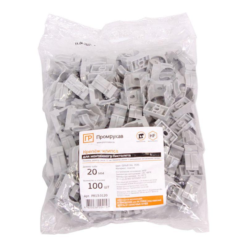 Держатель для труб (клипса) d20мм для монтажного пистолета сер. в п/э Промрукав PR13.0120