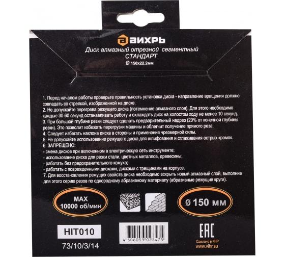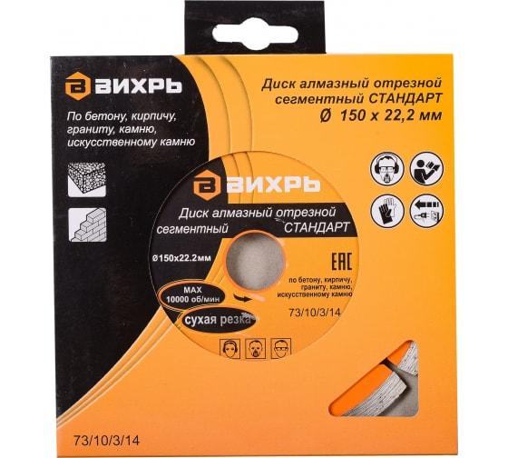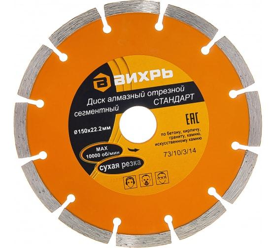 Диск алмазный отрезной сегментный СТАНДАРТ 150х22.2мм сухая резка Вихрь 73/10/3/14