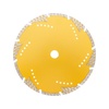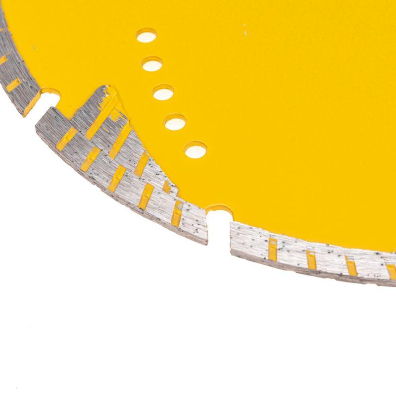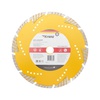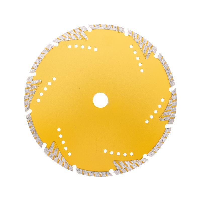 Диск алмазный отрезной Turbo KRANZ предназначен для сухой резки строительных материалов, таких как природный и искусственный камень, армированный бетон, кирпич, керамика. Используется в угловой шлифовальной машине, ручном электрическом плиткорезе, штроборезе. Диск оснащен защитными секторами, которые обеспечивают защиту режущего слоя от бокового износа, что значительно продлевает срок службы. Уникальная форма алмазных сегментов позволяет использовать диск без охлаждения, обеспечивает быстрый и аккуратный рез, позволяет выполнять кратковременную обработку боковой поверхностью без риска поломки. Диск выполнен из инструментальной стали и синтетического алмаза. Изготовлен методом горячего прессования, что значительно улучшает качество металлической связки и обеспечивает высокую концентрацию алмазов. Процесс резки сопровождается воздушным охлаждением. Срок годности не ограничен. Хранить в сухом прохладном месте. Использовать строго по назначению. Внимание! Запрещается использовать диск для разрезания металлов. При установке диска руководствуйтесь стрелкой направления вращения диска. Используйте средства индивидуальной защиты. Не утилизируйте с бытовыми отходами.
