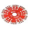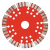 Диск алмазный Turbo Segment предназначен для армированного бетона, слабо армированного бетона, бетона, бордюрного камня, натурального камня, тротуарной плитка, кирпича. Особенности: рифлёные сегменты режущей кромки обеспечивают высокую скорость реза, перфорация корпуса способствует дополнительному охлаждению диска. Технология производства: горячее прессование