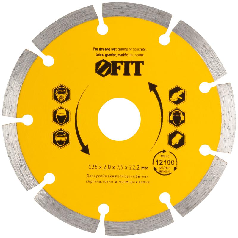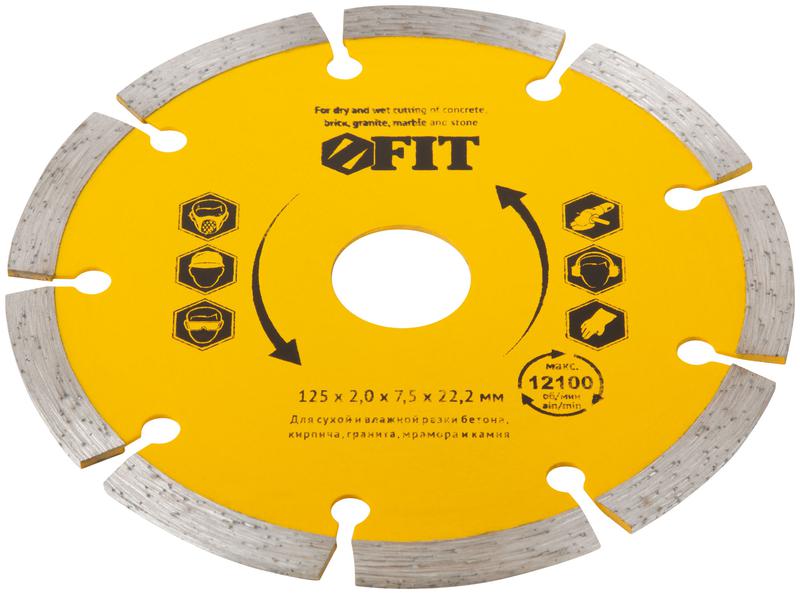 Диск отрезной алмазный сегментный FIT IT предназначен для сухой и влажной резки кирпича, бетона, мрамора, гранита и других твердых материалов. Для использования с УШМ. Сегментная режущая кромка высотой 7,5 мм обеспечивает охлаждение диска в процессе работы, предотвращая его перегрев. Высокая производительность и идеальная балансировка способствуют качественной работе.