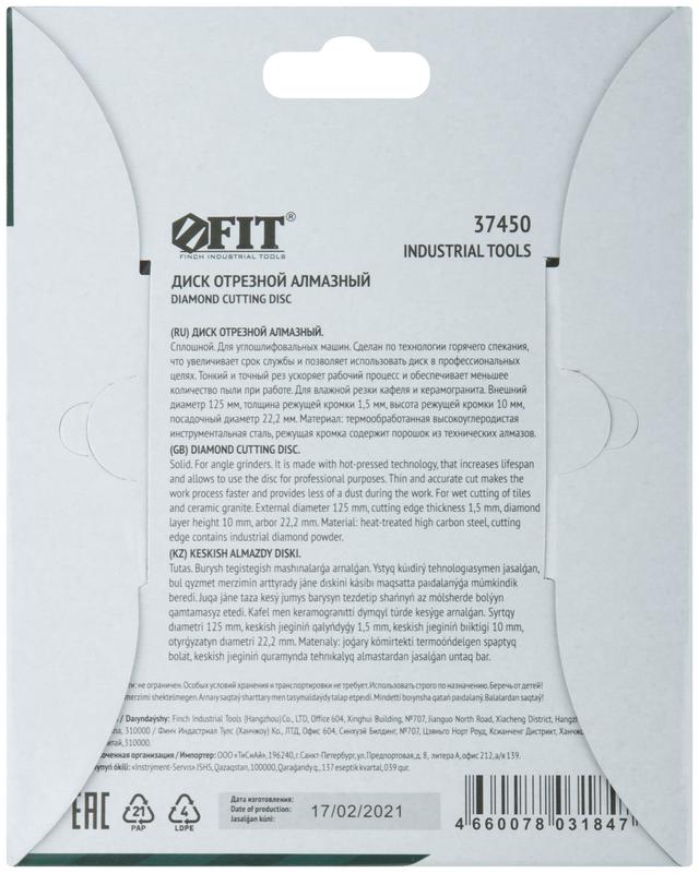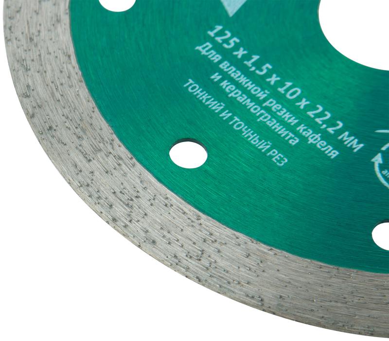 Диск отрезной алмазный сплошной предназначен для влажной резки кафеля и керамогранита. Обеспечивает тонкий рез. Используется с УШМ. Диски отличаются высокой износостойкостью, так как изготовлены по технологии горячего спекания. Корпус диска, изготовленный из термообработанной высокоуглеродистой инструментальной стали, выдерживает высокие температуры и механические нагрузки. Высокий рабочий ресурс дисков достигается за счет повышенной концентрации алмазного зерна в режущей кромке.