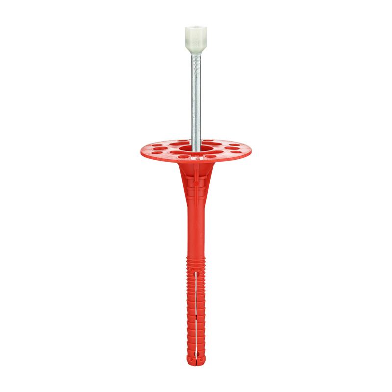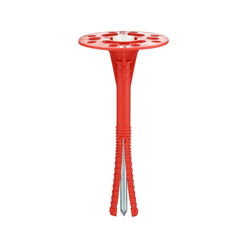 Тарельчатый дюбель IZL-T состоит из следующих элементов: дюбель с двухсегментной распорной зоной и увеличенной прижимной шайбой диаметром 60 мм, и распорный элемент – гвоздь с термоголовкой, которая предотвращает образование «мостика холода». Дюбель выполнен из полипропилена, гвоздь – из углеродистой стали с антикоррозионным горячеоцинкованным покрытием, термоголовка гвоздя – из полиамида. Дюбель предназначен для крепления теплоизоляционных строительных материалов и изделий (толщиной до 240 мм) к основаниям из бетона, кладки из полнотелого силикатного керамического и пустотелого керамического кирпича, ячеистого бетона. Установка производится методом сквозного монтажа. В среднем на 1 кв. м площади теплоизоляции применяется 5-6 дюбелей.