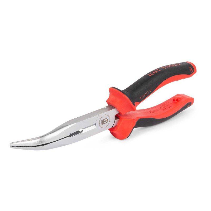 • Для работы под напряжением до 1000 В • Предназначены для работ в труднодоступных местах • Угол изгиба захватных губок: 40° • Захватные губки с зубцами и режущими кромками для среднетвердой и твердой проволоки • Режущие кромки дополнительно закалены токами высокой частоты. HRC 62 • Материал рабочей части: хром-ванадиевая сталь • Обработка поверхности: матовое никелирование • Двухцветные многокомпонентные рукоятки с упорами для защиты от соскальзывания • Длина: 200 мм • Вес: 206 г