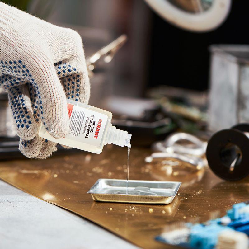 Ортофосфорная кислота REXANT предназначена для удаления оксидов с поверхности под пайку, улучшения растекания жидкого припоя при пайке окисленной меди, нержавеющей стали, черных или цветных металлов. Изготовлена в соответствии с ГОСТ 10678-76. Применяется в качестве флюса при пайке или лужении деталей низкотемпературными припоями. Также используется для очистки от ржавчины металлических поверхностей, образуя защитную пленку и предотвращая образование коррозии. После завершения паяльных работ остатки флюса необходимо удалить водой. Не рекомендуется использовать данную кислоту при пайке высокочастотных элементов, печатных плат и прочих контактов из-за кислотности остатков, так как есть риск разъедания материала. Содержание ортофосфорной кислоты составляет 75%. Вариант фасовки – флакон объемом 30 мл.