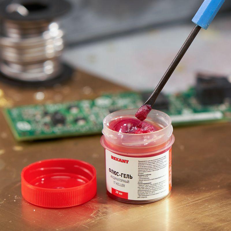 Флюс-гель TT индикаторный REXANT применяется для высококачественной пайки электронных компонентов, радиотехнических изделий и посадки SMD-компонентов. Подходит для пайки практически всех металлов и сплавов. В состав входит красный индикатор активности, который после пайки обесцвечивается, свидетельствуя об отсутствии активного компонента в месте пайки. По завершении работ остатки флюса предохраняют паяный шов от коррозии, поэтому смывка остатков не рекомендуется. При необходимости остатки флюса можно удалить уайтспиритом, растворителем №646 или горячей водой. Температура наибольшей активности: +170...+250 ?. Основные компоненты: вазелин технический, тетраэтиленгликоль, эмульгатор и термокраситель. Вариант фасовки – банка объемом 20 мл.