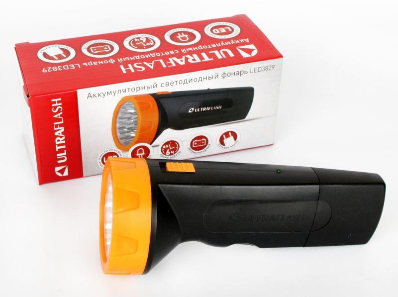 Фонарь Ultraflash электрический светодиодный аккумуляторный. Цвет корпуса: черный + желтый. Материал корпуса - пластик. Источник света - 9 светодиодов в индивидуальных отражателях. Дистанция освещения - до 25 метров. Один режим работы. Выключатель - тумблер. Время работы при полностью заряженном аккумуляторе: до 6 часов. Заряд напрямую от сети ~220 вольт. Время заряда 8 ч. Комплектация: фонарь, свинцово-кислотный аккумулятор с напряжением 4 В емкостью 0,7 А-ч, светодиодный индикатор заряда, открепительная крышка сетевой вилки, инструкция, упаковка. Степень пыле-влаго-защиты IP22. Упаковка - коробка. Максимальный линейный размер фонаря 16 см. Размер упаковки 7 см x 16,5 см x 7 см. Вес без упаковки 0,117 кг. Вес с упаковкой 0,145 кг.
