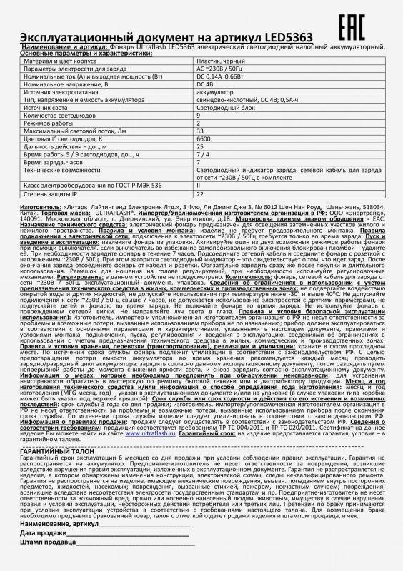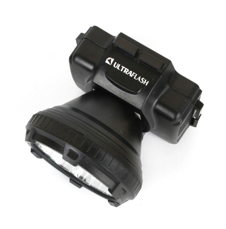 Фонарь Ultraflash электрический светодиодный налобный аккумуляторный. Цвет корпуса: матовый черный. Материал корпуса - пластик. Источники света: 9 светодиодов со световым потоком 33 люмен. Дистанция освещения - до 25 метров. Два режима работы. Выключатель: двухпозиционный кнопочный. Время работы при полностью заряженном аккумуляторе: 5 светодиодов - до 7 часов, 9 светодиодов - до 4 часов. Время заряда - 7 часов. Комплектация: фонарь, свинцово-кислотный аккумулятор с напряжением DC 4 В емкостью 0,5 А-ч, сетевой кабель для заряда от сети ~220 вольт, поворотный отражатель, эластичный ремешок для ношения на голове, инструкция, упаковка. Степень пыле-влаго-защиты IP22. Упаковка - коробка. Максимальный линейный размер фонаря 7,5 см. Размер упаковки 9,5 см x 9 см x 8,2 см. Вес без упаковки 0,16 кг. Вес с упаковкой 0,22 кг.