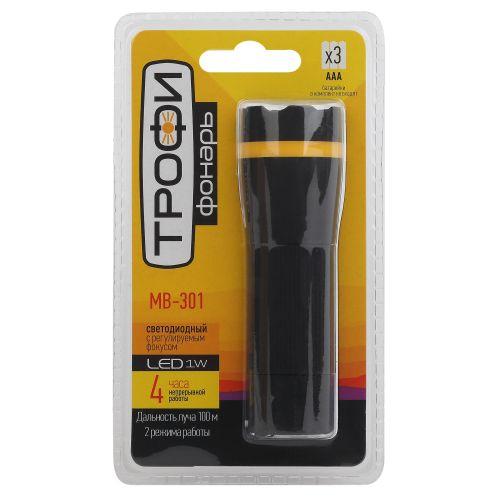 ТРОФИ MB-301 (артикул Б0033750) — лёгкий ручной LED-фонарь для работы, кемпинга и универсального бытового применения. Отличается ярким дальним лучом 100 метров с фокусировкой. Корпус изготовлен из металла и ударопрочного пластика. Компактный фонарик работает от 3 мизинчиковых батареек. Одного комплекта элементов питания хватает на 4 полных часа непрерывного свечения. Простой в управлении, удобный и практически невесомый, ТРОФИ МВ-301 станет надёжным помощником в дороге, на природе, на даче, в гараже.