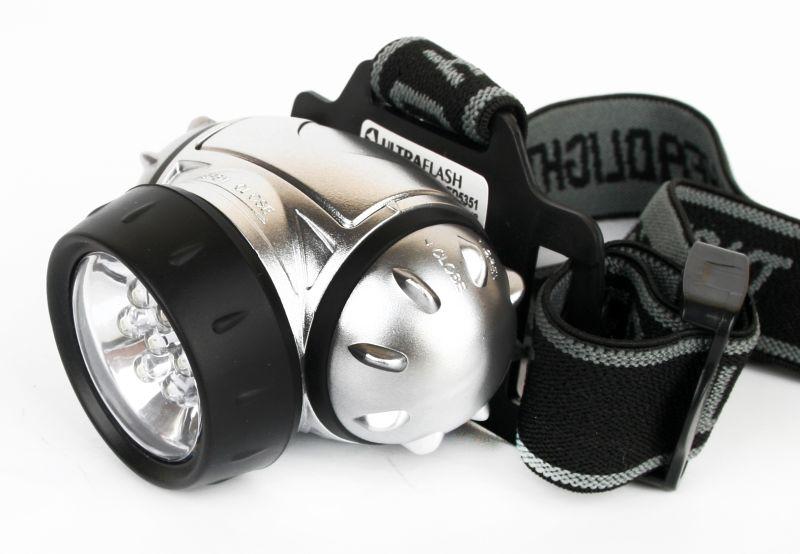 Фонарь Ultraflash электрический светодиодный налобный. Цвет корпуса: серебро + чёрный. Работает от 3 X AAA батареек (не входят в комплект). Материал корпуса - пластик. Источник света - 7 светодиодов с рассеивающими линзами с цветовой температурой 6500К с осевой силой света одного светодиода - 10000 милликанделл, суммарный световой поток 15 люмен. Дистанция освещения - до 20 метров. Три режима работы. Выключатель - трехпозиционный кнопочного типа. Время работы при использовании солевых батареек: 1 светодиод - до 70 часов, 3 светодиода - до 35 часов, 7 светодиодов - до 25 часов. Комплектация: фонарь, эластичный ремешок для ношения на голове, поворотный отражатель, инструкция, упаковка. Степень пыле-влаго-защиты IP44. Упаковка - коробка. Максимальный линейный размер фонаря 6,8 см. Размер упаковки 5 см x 8 см x 10 см. Вес без упаковки 0,07кг. Вес с упаковкой 0,10 кг.