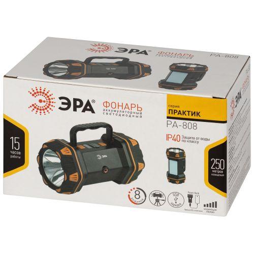 ЭРА «Практик» PA-808 – многофункциональный прожекторный фонарь с ёмким литиевым аккумулятором. Имеет множество режимов свечения: основной свет (100% яркости и 50% яркости), боковой свет (100% яркости и 50% яркости), свет с обратной стороны (100% яркости, 50% яркости, красный свет, красный мигающий). Всего – 65 светодиодов для создания яркой практичной подсветки. Этот современный фонарь имеет различные крепления и поможет организовать качественное портативное освещение в любой ситуации. Предусмотрено гнездо под штатив. Ещё одно преимущество – возможность использовать фонарь ЭРА PA-808 в качестве пауэрбанка для оперативной подзарядки мобильных устройств. Сам фонарь удобно заряжается при помощи кабеля microUSB и непрерывно светит от одного полного заряда до 15 часов. Имеется индикатор заряда