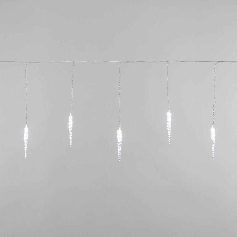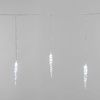 Гирлянда «Сосульки» длиной 1,5 метра, выполнена в виде ассиметричных нитей: на проводе-основе находятся 10 вертикальных отрезков по 20 и 25 сантиметров, на которых размещены 10 ярких диодов белого свечения. Электрический кабель защищен от повреждений слоем эластичной изоляции из прозрачного ПВХ. 10 насадок в виде сосулек эффектно подсвечиваются диодами, имитируя сверкание настоящего льда. Для подключения к электрической сети не понадобится удлинитель: собственная длина питающего шнура составляет 3 метра.