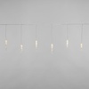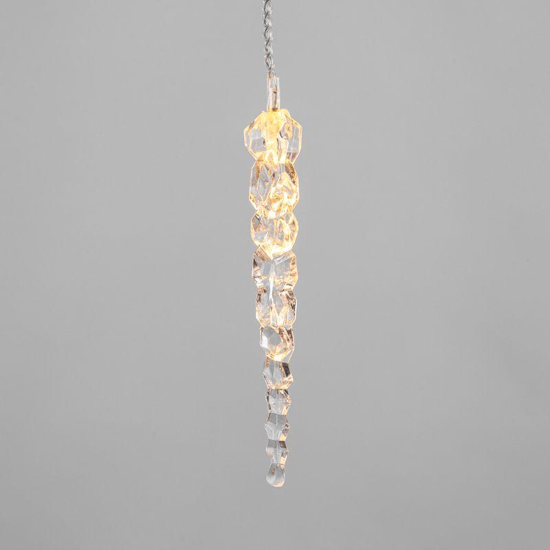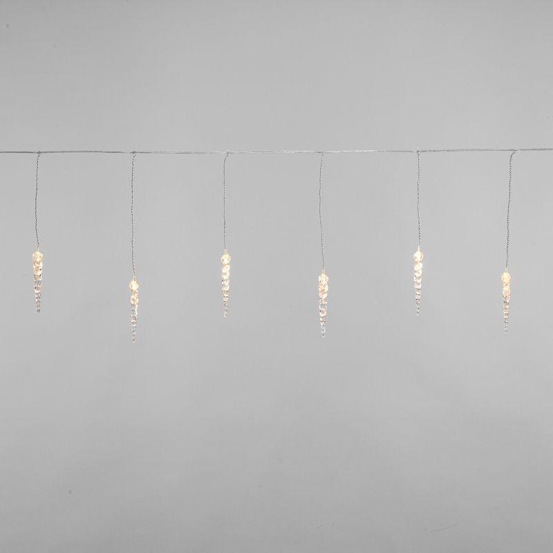 Гирлянда «Сосульки» длиной 1,5 метра работает в режиме постоянного свечения. Изделие выполнено в виде ассиметричных нитей 0,2–0,25 метра. Шнур в оболочке из прозрачного ПВХ служит основой для 10 диодов теплого белого свечения, которые скрываются внутри декоративных сосулек размером 11,5 см. Яркий свет играет в сосульках, создавая эффект сверкающего изнутри льда. Гирлянда с защитой IP20 питается от сети 230 В, для подключения к розетке предусмотрен трехметровый кабель.