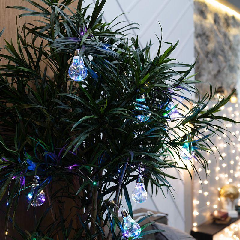 Гирлянда «Ретро-лампы» длиной 3 метра — необычное, стильное интерьерное украшение, которое разнообразит обстановку не только в новогодние праздники, но и в будни. Изделие представляет собой гибкий шнур, на котором находятся 100 диодов, светящихся разноцветными огнями. Дополнительно на кабеле расположены 10 насадок в виде аутентичных ламп накаливания с серебристым цоколем, эффектно подсвечиваемые диодами изнутри. Гирлянда не нуждается в подключении к стандартной электросети: питается от 3 батареек типа АА, что говорит об абсолютной безопасности использования.