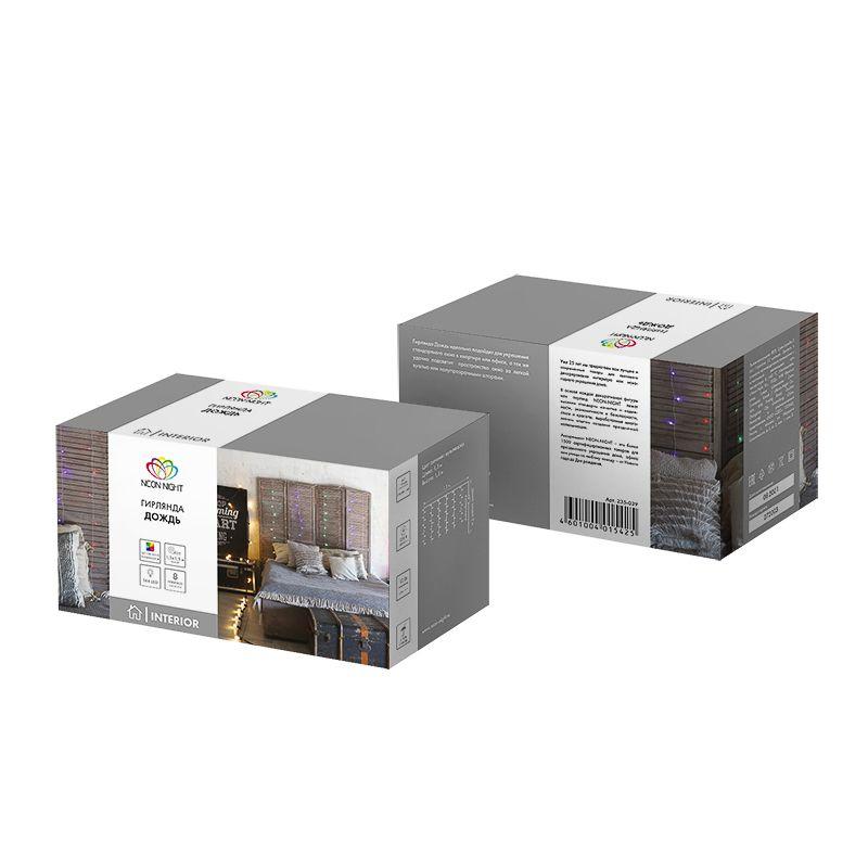 Гирлянда «Дождь» 1,5?1,5 м выполнена в виде занавеса и во включенном состоянии создает россыпь разноцветных огней, которые меняют ритм свечения под управлением контроллера. Контроллер имеет 8 режимов свечения: 7 динамических и 1 статичный. 144 ярких разноцветных светодиода, расположенных на проводе из прозрачного ПВХ, в затемненном помещении создают эффект струящегося дождя — великолепное зрелище, которое привлекает внимание и заставляет подолгу любоваться игрой света. Гирлянда подключается в электросеть 230 В при помощи шнура питания длиной 3 метра. Светодиодный занавес — идеальное решение для оформления окон.