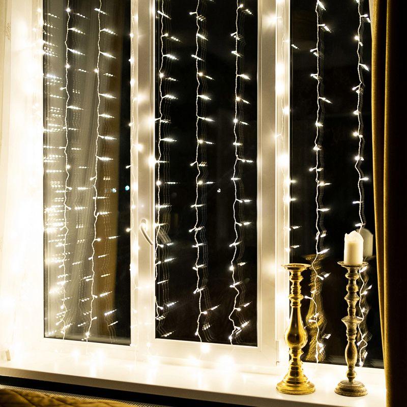 Гирлянда «Дождь» 2,5?2 м представляет собой декоративный занавес, на котором размещены 300 ярких диодов, излучающих теплый белый свет. В основе находится горизонтальный провод в оболочке из прозрачного ПВХ, к которому крепятся аналогичные нити длиной 2 метра. Для подключения в электросеть предусмотрен кабель длиной 3 метра, позволяющий обойтись без дополнительного удлинителя. Степень защиты изделия — IP20, подходит для использования только внутри помещения. 8 разных режимов свечения переключаются одним нажатием кнопки на контроллере.