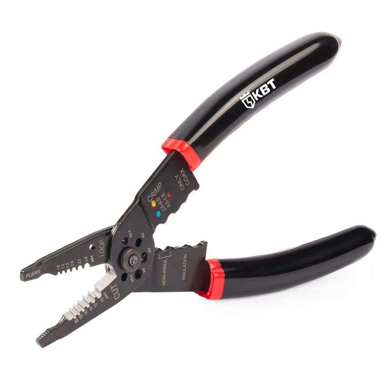 • 6 в 1: • снятие изоляции с проводов сечением 0.5–4.0 мм2 • резка проводов сечением до 6 мм2 • резка винтов М2.5, М3, М3.5, М4, М5 • опрессовка наконечников сечением 0.5–6.0 мм2 и коаксиальных разъемов • пассатижи • отверстия для формирования петель • Шестипозиционные прецизионно заточенные лезвия для снятия изоляции. Твердость HRC 60 • Материал корпуса: качественная инструментальная сталь • Двухслойные нескользящие рукоятки выполнен по технологии «окунания» • Соединительный винт с возможностью регулировки зазора • Вес: 180 г • Длина: 210 мм