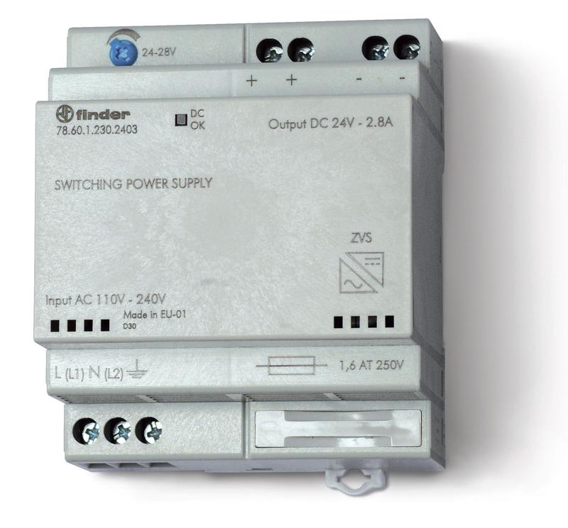 Источник питания импульсный вход 110...240В AC / выход 24В DC 60Вт модульный 70мм предохранитель входой цепи настройка выходного напряжения IP20 FINDER 786012302403