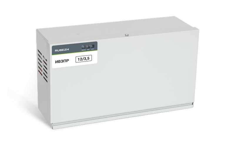 Источник питания ИВЭПР 12/3,5 имеет несколько исполнений корпусов для установки одной или двух АКБ ёмкостью от 7 Ач до 17 Ач. Предусмотрена техническая возможность подключения боксов резервного электропитания БР 12 для увеличения времени непрерывной работы от АКБ. Преимущества В состав схемы ИВЭПР 12/3,5 входит электронный ключ, позволяющий постоянно тестировать наличие и состояние аккумуляторной батареи, а также управлять процессом её заряда. Зарядный ток находится в обратной зависимости от степени заряда АКБ. Таким образом, по мере заряда АКБ величина зарядного тока уменьшается и в конечном итоге остаётся на уровне компенсации саморазряда АКБ. Схема заряда, компенсируя саморазряд, поддерживает напряжение на АКБ на максимальном уровне, при этом полностью исключена ситуация перезаряда и разогрева АКБ. Каждая АКБ имеет свою цепь заряда, таким образом, уровень зарядного тока поддерживается для каждой АКБ индивидуально. Источник не производит заряд АКБ с напряжением ниже 10 В, поскольку глубоко разряженные АКБ являются, как правило, неисправными и непригодными к эксплуатации. Импульсная схема ИВЭПР обеспечивает высокий коэффициент полезного действия, что снижает затраты на электроэнергию при эксплуатации, а также сводит к минимуму тепловыделение источника, которое негативно сказывается на сроке службы аккумуляторной батареи. ИВЭПР отличается высокой надёжностью, расширенным диапазоном сетевого напряжения 130 В - 265 В, увеличенным температурным диапазоном от -10 °C до +50 °C и пониженным уровнем высокочастотных помех. ИВЭПР 12/3,5 обеспечивает: автоматический заряд АКБ при наличии сети переменного тока; - автоматический переход на работу от АКБ при снижении сетевого напряжения ниже минимального рабочего значения и возврат на питание от сети при восстановлении сетевого напряжения; электронную защиту от переполюсовки при подключении АКБ и замыкания клемм присоединения АКБ. При работе от сети переполюсовка или замыкание клемм АКБ не влияет на выходное напряжение; защиту аккумуляторной батареи от глубокого разряда путём отключения нагрузки при снижении напряжения на АКБ ниже определённого значения. При отсутствии сетевого напряжения после подключения исправной, заряженной АКБ источник выходит на заданный режим выходного напряжения автоматически; электронную защиту источника от короткого замыкания и перегрузок по току. После устранения режима короткого замыкания или перегрузки источник автоматически восстанавливает выходное напряжение; защиту схемы источника от повреждений при скачках сетевого напряжения за счёт наличия металлоксидного варистора; термозащиту, обеспечивающую отключение нагрузки при перегреве элементов ИВЭПР вследствие длительной работы при нагрузке, превышающей номинальную, или при повышенной температуре окружающей среды. После остывания источника напряжение автоматически подается на нагрузку; защиту нагрузки от повышенного напряжения в случае неисправности схемы стабилизации источника. Источник имеет независимые схемы контроля и заряда для каждой из АКБ. К источнику может подключаться необходимое количество внешних боксов типа БР12 с дополнительными АКБ и схемами подзаряда и контроля. Выход источника гальванически изолирован от корпуса. Корпус имеет винт защитного заземления. На передне