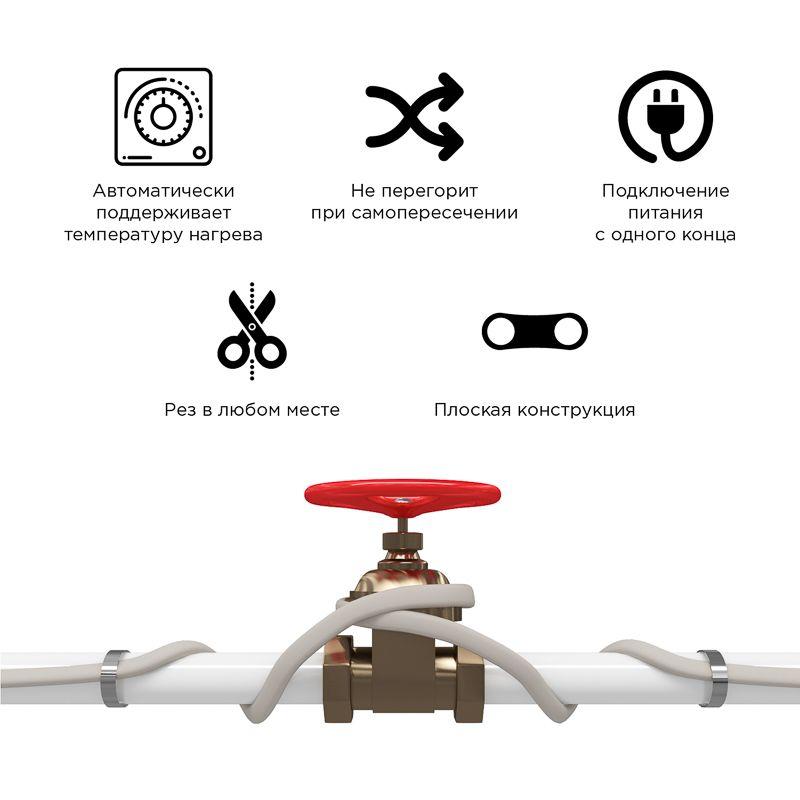 Саморегулирующийся греющий кабель SRL16-2 PROconnect мощностью 16 Вт/м предназначен для защиты от замерзания бытовых трубопроводов диаметром не более 150 мм, счетчиков воды, вентилей и так далее. Принцип работы греющего кабеля заключается в автоматической регулировке степени нагревания в зависимости от внешних условий. Повышение температурного режима окружающей среды приводит к снижению выделения тепла, и наоборот — холодный воздух провоцирует активность нагревательного элемента. Устанавливается на трубопровод под теплоизоляцию и фиксируется с алюминиевым скотчем или термостойкой клейкой лентой. Для герметизации соединения саморегулирующегося греющего кабеля с кабелем питания и герметичной заделки его противоположной стороны, используются наборы для концевой заделки REXANT: артикулы 51-0614 и 51-0615.