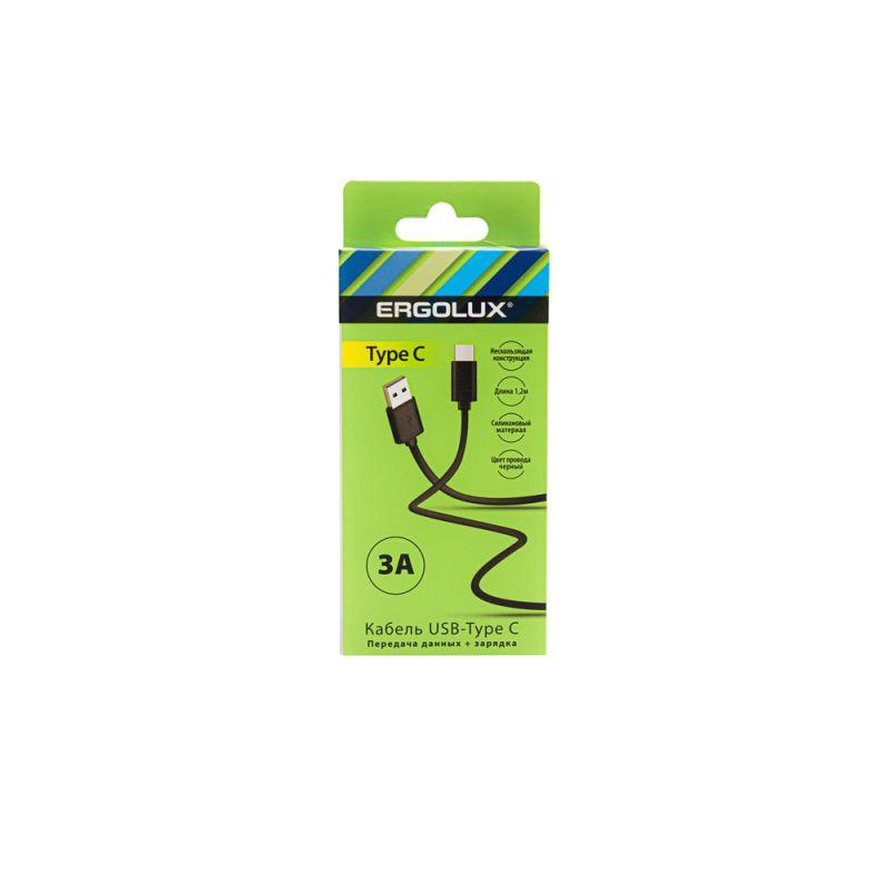 Кабель USB-Type C 3А 1.2м зарядка + передача данных черн. (коробка) ERGOLUX 15094