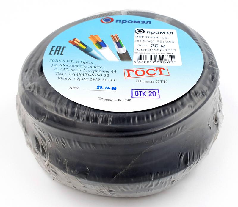 Кабель ВВГ-Пнг(А)-LS 3х1.5 (N PE) 0.66кВ (уп.20м) ПромЭл 13321860