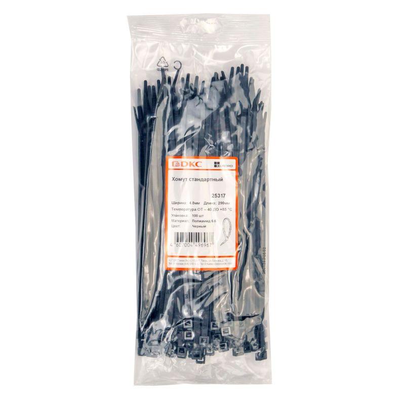 Хомуты (или, иначе, стяжки) – это популярный крепежный элемент, применяющийся при монтажных или строительных работах. Хомуты ДКС прочны, устойчивы к коррозии и воздействию агрессивных сред, что позволяет использовать их не только внутри помещений, но и на улице. С помощью гибких хомутов можно создавать как жесткие, так и подвижные соединения. Ребристые внутренняя и внешняя стороны обеспечивают надежную фиксацию и предотвращает соскальзывание хомута. Изделие имеет длину 290 мм, ширину 4,8 мм, устойчивость к растяжению 220 H. Не рекомендуется использовать стяжки в зонах, где они будут подвергаться воздействию прямых солнечных лучей. Температура монтажа составляет от -30 °С до +60 °С, температура эксплуатации – от -45 °С до +85 °С. Материал – полиамид. Цвет – черный.