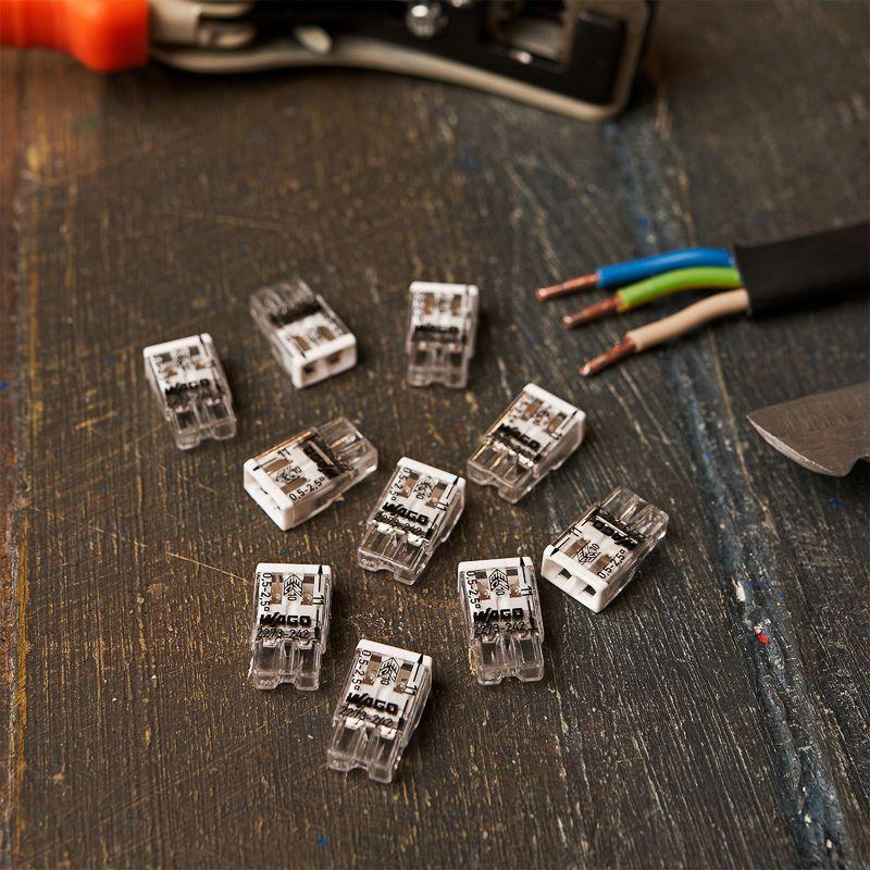 Элетромонтажные экспресс-клемы WAGO 2273-242 позволят безопасно и быстро соединить 2 провода между собой (алюминиевые и медные как одножильные, так и многожильные). Достаточно просто вставить жилу кабеля или провода в клемму и самозажимной контакт надежно зафиксирует соединение. Диаметр соединяемых проводов должен составлять в сечении от 0,5 до 2,5 кв.мм. Номинальный ток 24А; Номинальное напряжение 450В. Удобные тестовые гнезда, прозрачный корпус для визуального контроля и смотровое окно для проверки защиты от касаний делают работу более безопасной. Наличие пасты обеспечивает надёжную изоляцию контакта