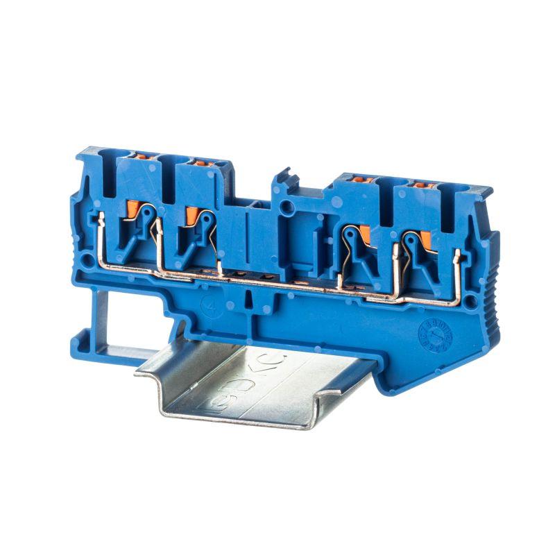 Проходная клемма с зажимом Push-in предназначена для соединения четырех проводников, а за счет кнопки- толкателя обеспечивается защита от ошибок при монтаже и случайного прикосновения. Монтаж осуществляется на DIN-рейку OMEGA. Температура эксплуатации от -40 до +105оС. Корпус выполнен из ПА 6.6 с классом горючести V0 UL-94. Синий цвет, 4 точки подключения, 2.5 мм2. 2 канала для вставных перемычек. Габариты (В?Ш?Г) 37,2?73?5,2 мм.