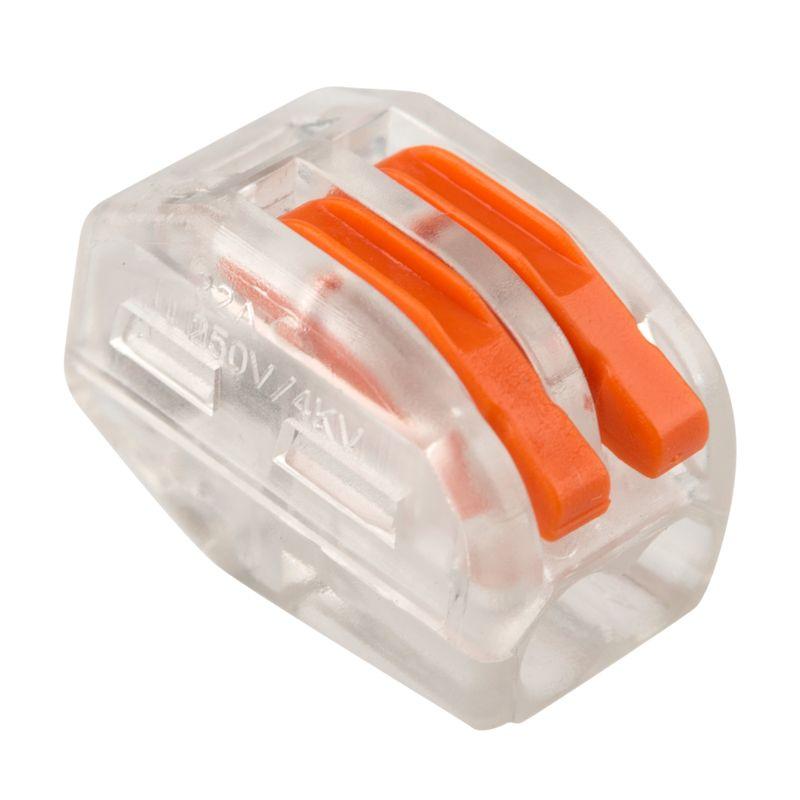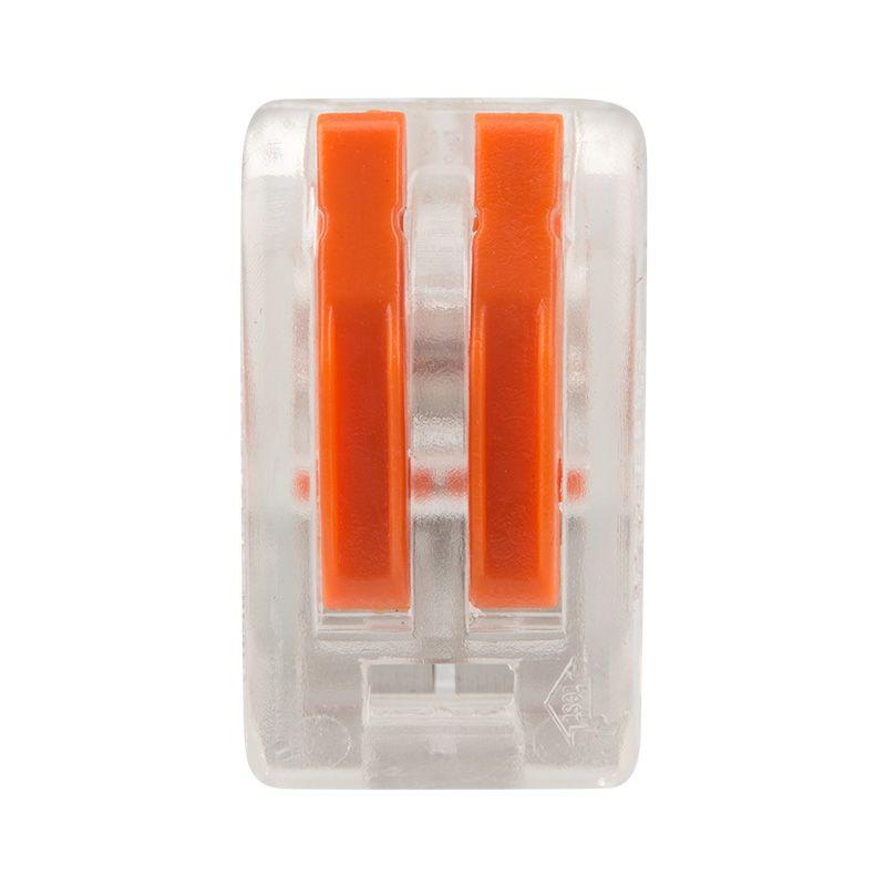 Соединительная многоразовая клемма REXANT на 2 проводника с плоско-пружинным зажимом в прозрачном корпусе предназначена для подсоединения медных одножильных и многожильных проводников тонкого сечения. Перед монтажом с соединяемых проводников необходимо снять изоляцию в соответствии с обозначениями на корпусе клеммы (9-12 мм). Зачищенный участок с монтажной стороны не должен иметь сильных изгибов. Вставьте его в свободное гнездо клеммы, предварительно подняв оранжевый рычажок, после этого опустите рычажок в исходное положение. Контакт осуществляется путем зажима проводника пластиной. Конструкция предотвращает случайное размыкание контакта. Специальное технологическое отверстие на корпусе клеммы предназначено для проверки соединения тестером-пробником или щупом мультиметра. Оболочка из прозрачного пластика делает контакт изолированным, а также позволяет визуально оценить положение проводника. Извлечение проводника (демонтаж) осуществляется действиями в обратном порядке. Характеристики: Размер: 12.4x14.5x20.5 мм Материал: Полиамид 66 Количество контактов: 2 Материал контактов: луженая медь Зажим: сталь Цвет: прозрачный Напряжение: 400 В Материал подключаемых проводов: Cu Типы подключаемых проводов: одножильные, многожильные Ток: для одножильных проводов — 32 А, для многожильных проводов — 24 А\28-12 AWG Поддерживаемое сечение: 2x0.08-4 мм2 (одножильный провод), 2x0.08-2.5 мм2 (многожильный провод) Рабочая температура: –40...+85 ?C