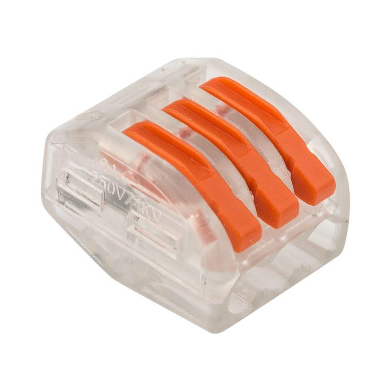 Соединительная многоразовая клемма REXANT на 3 проводника с плоско-пружинным зажимом предназначена для подсоединения медных одножильных и многожильных зачищенных проводников тонкого сечения. Перед монтажом с соединяемых проводников необходимо снять изоляцию в соответствии с обозначениями на корпусе клеммы (9-12 мм). Зачищенный участок с монтажной стороны не должен иметь сильных изгибов. Вставьте его в свободное гнездо клеммы, предварительно подняв оранжевый рычажок, после этого опустите рычажок в исходное положение. Контакт осуществляется путем зажима проводника пластиной. Конструкция предотвращает случайное размыкание контакта. Специальное технологическое отверстие на корпусе клеммы предназначено для проверки соединения тестером-пробником или щупом мультиметра. Оболочка из прозрачного пластика делает контакт изолированным, а также позволяет визуально оценить положение проводника. Извлечение проводника (демонтаж) осуществляется действиями в обратном порядке. Характеристики: Размер: 17x14.5x20.5 мм Материал: Полиамид 66 Количество контактов: 3 Материал контактов: луженая медь Зажим: сталь Цвет: прозрачный Напряжение: 400 В Материал подключаемых проводов: Cu Типы подключаемых проводов: одножильные, многожильные Ток: для одножильных проводов — 32 А, для многожильных проводов — 24 А\28-12 AWG Поддерживаемое сечение: 3x0.08-4 мм2 (одножильный провод), 3x0.08-2.5 мм2 (многожильный провод) Рабочая температура: –40...+85 ?C