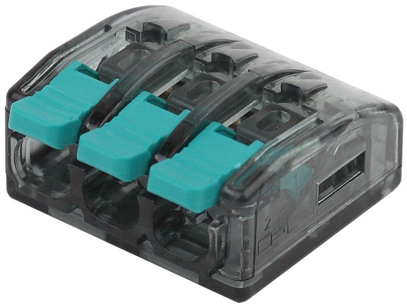 Клеммы СМК компактная с плоско-пружинным зажимом предназначены для многоразового присоединения и ответвления одножильных и многожильных проводников из меди в электрических цепях переменного тока с частотой 50 Гц напряжением до 400 В. Клемма имеет более компактные размеры в сравнении с привычными ручейковыми клеммами, прозрачный корпус позволяет контролировать контакт проводников с контактными пластинами. Корпус клемм изготовлен из самозатухающего пластика, монтаж не требует использования инструментов. Подходит для многоразового использования. При монтаже необходимо снять изоляцию с проводников в соответствии с обозначениями на корпусе клеммы. Поднимите рычажок, вставите проводник в гнездо, опустите рычажок в исходное положение.