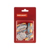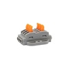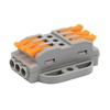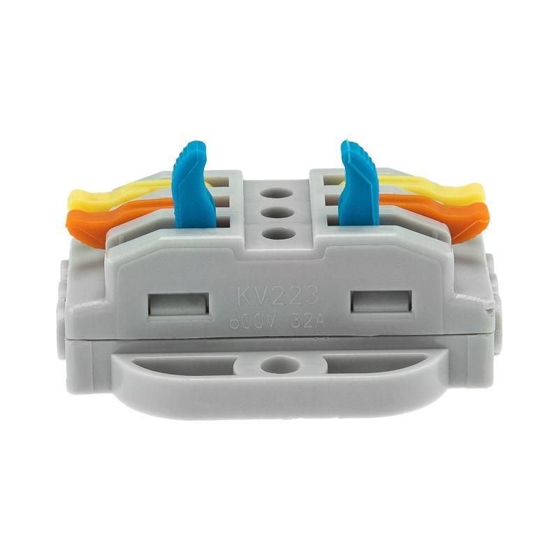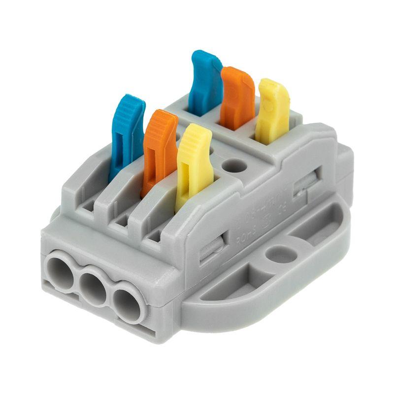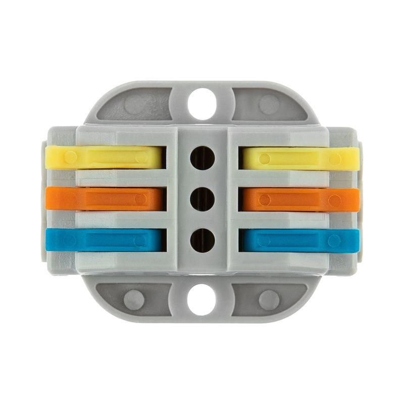 Многоразовые трехпроводные клеммы REXANT с монтажной площадкой предназначены для соединения медных одножильных и многожильных зачищенных проводников тонкого сечения. Контакт осуществляется путем зажима проводника пластиной. Конструкция предотвращает случайное размыкание контакта. Специальное технологическое отверстие на корпусе клеммы предназначено для проверки соединения тестером-пробником или щупом мультиметра. Корпус из пластика делает контакт изолированным. 1. Сечение многожильного провода – 0,08-4 мм2 2. Сечение одножильного жесткого провода – 0,08-2,5 мм2 3. Номинальный ток – 32 А 4. Номинальное рабочее напряжение – 400 В 5. Тип соединения – фиксатор/защелка 6. Количество вводов – 6