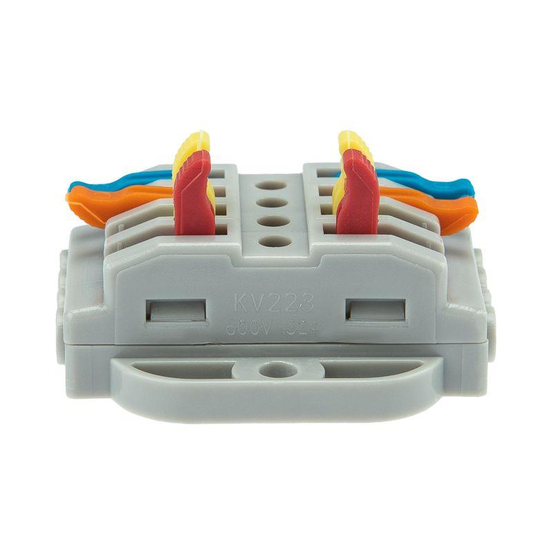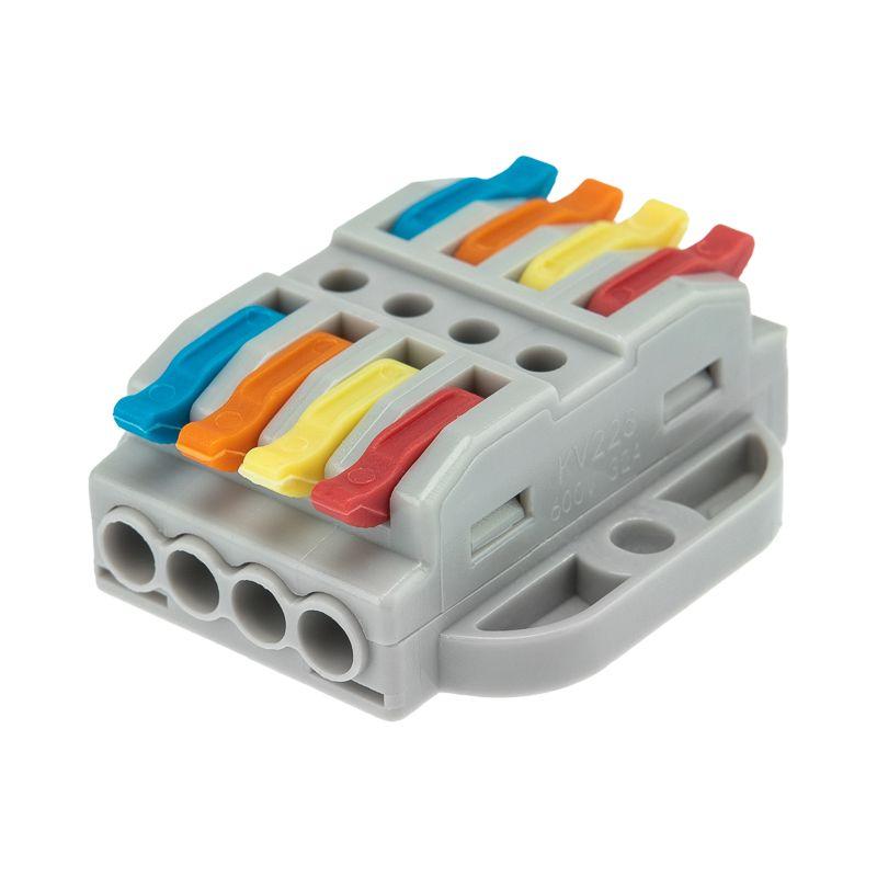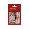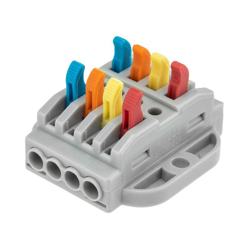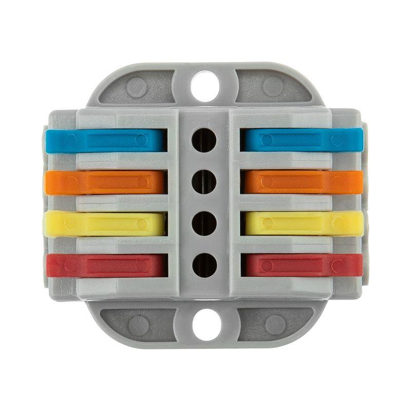 Многоразовые четырехпроводные клеммы REXANT с монтажной площадкой предназначены для соединения медных одножильных и многожильных зачищенных проводников тонкого сечения. Контакт осуществляется путем зажима проводника пластиной. Конструкция предотвращает случайное размыкание контакта. Специальное технологическое отверстие на корпусе клеммы предназначено для проверки соединения тестером-пробником или щупом мультиметра. Корпус из пластика делает контакт изолированным. 1. Сечение многожильного провода – 0,08-4 мм2 2. Сечение одножильного жесткого провода – 0,08-2,5 мм2 3. Номинальный ток – 32 А 4. Номинальное рабочее напряжение – 400 В 5. Тип соединения – фиксатор/защелка 6. Количество вводов – 8