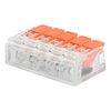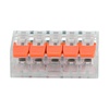 Многоразовая 5-проводная клемма REXANT это один из самых быстрых, надежных и удобных способов монтажа проводников при небольшой потребности в пространстве в точке коммутации, в условиях нехватки и ограничения пространства. Конструкция на 30 % компактнее привычных рычажковых клемм, прозрачный корпус позволяет контролировать контакт проводников с контактными пластинами, правильность зачистки проводников. Широкие плоские рычаги с меньшим прижимным усилием более удобны и надежны в работе, наличие двух гнезд для тестовых щупов с обеих сторон клеммы облегчает доступ и контроль соединения и питания. Такие клеммы используются для соединения проводников сечением 0,14-4 мм2, а также одножильных и тонкожильных проводников сечением 0,2-4 мм2 (24–12 AWG), они могут передавать ток до 32 А/450 В при максимальной температуре до 85 °C. Характеристики: Размер: 13x9,5x19 мм Материал: Полиамид 66 Количество контактов: 5 Материал контактов: луженая медь Зажим: сталь Цвет: прозрачный Напряжение: 450 В Ток: 32 А Поддерживаемое сечение: 5x0,2-4 мм2 (одножильный провод), 5x 0,14-4 мм2 (многожильный провод) Длина зачистки изоляции: 11 мм Рабочая температура: –40...+85 ?C Поставляется в экономичной упаковке по 5 шт.