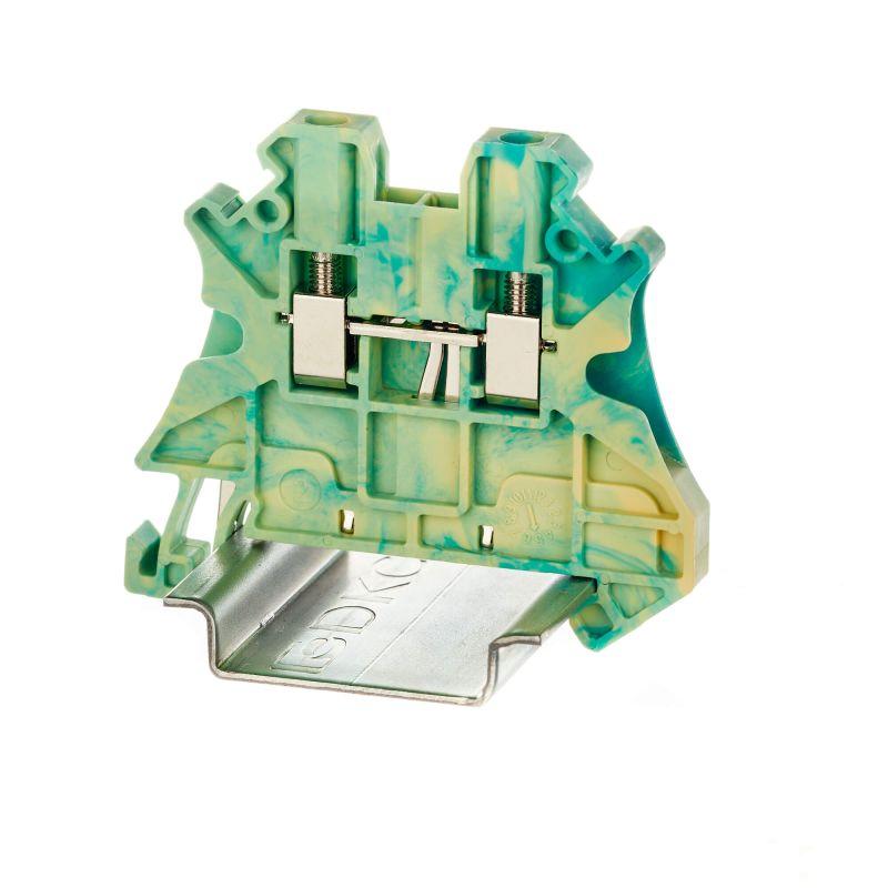 Клемма для заземления с винтовым зажимом предназначена для соединения двух проводников. Монтаж на DIN-рейку OMEGA. Температура эксплуатации от -40 до +105°C. Корпус выполнен из ПА 6.6 с классом горючести V0 UL-94. Имеет электрический контакт с DIN-рейкой. Желто-зеленый цвет, 2 точки подключения, 2.5 мм2. 1 канал для вставных перемычек. Габариты (В?Ш?Г) 47,5?53?5,2 мм.