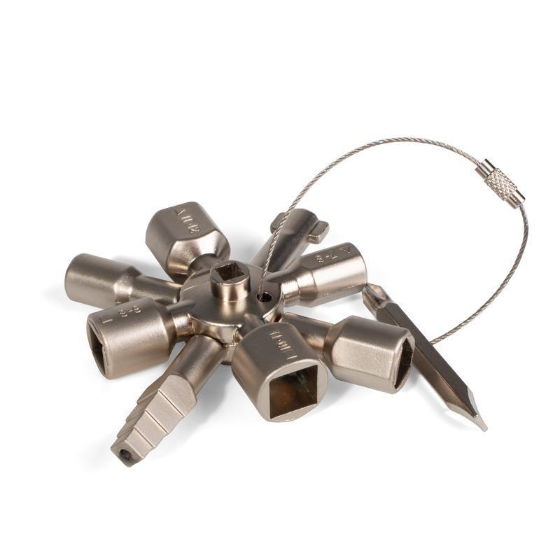 • Универсальный, многофункциональный ключ для использования в инженерных системах зданий и транспорта: сантехнических и электрических шкафах, системах вентиляции и кондиционирования воздуха • Ключ состоит из двух крестовин, соединенных между собой магнитами • Количество рабочих профилей ключа: 10 шт. • Типы профилей: • внутренний квадрат (4 сегмента): 5 / 6-7 / 6-8 / 10-11 мм • внутренний треугольник (3 сегмента): 7-8 / 9-10 / 11-12 мм • внешний квадрат (1 сегмент): 6, 7, 8, 9 мм • двойная бородка (1 сегмент): 3-5 мм • полукруг (1 сегмент): 6 мм • Двусторонняя бита PH2/SL7 мм (на гибком стальном тросике) • Материал ключа: цинковый сплав • Вес: 143 г • Длина: 92 мм