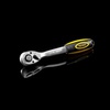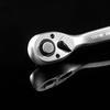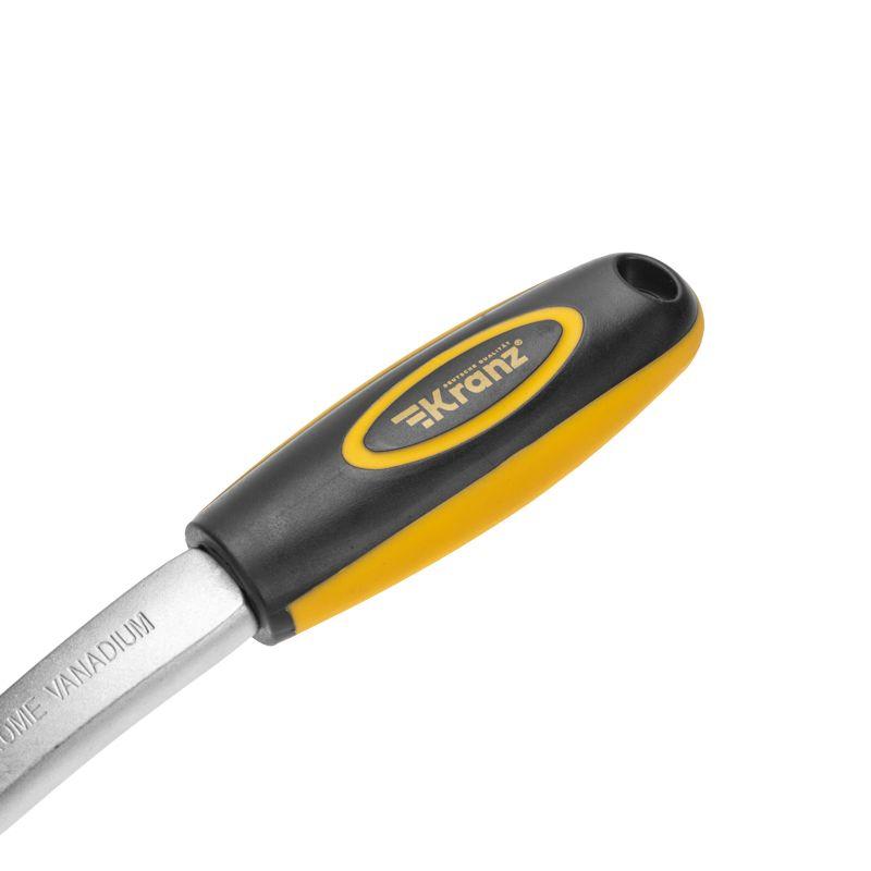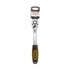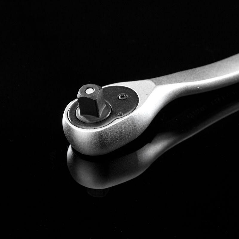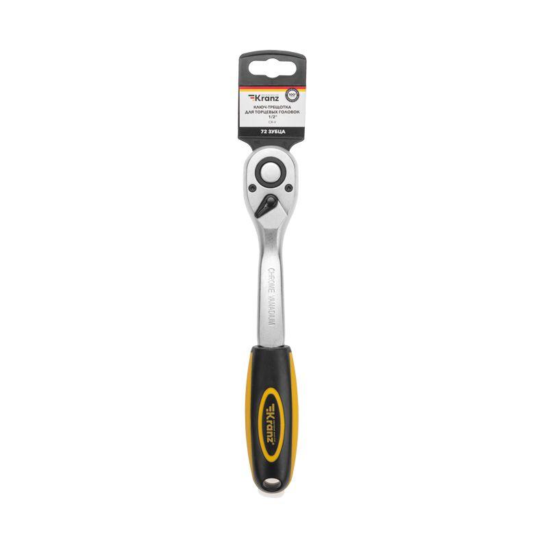 Ключ-трещотка для торцовых головок KRANZ предназначен для закручивания и раскручивания резьбовых соединений. Инструмент обладает высоким рабочим ресурсом. Оснащен цельнометаллическим корпусом с хромированной поверхностью. Изогнутая форма рукоятки создает дополнительное удобство при закручивании и раскручивании соединений, находящихся в труднодоступных местах. Прорезиненная рельефная рукоятка удобно лежит в руке в процессе работ. Инструмент служит для работы с торцевыми головками, которые соединяются при помощи посадочного квадрата 1/2 дюйма с подпружиненным шариковым фиксатором. Длина изделия – 260 мм. Количество зубьев – 72 шт. Материал изготовления – сталь СrV.