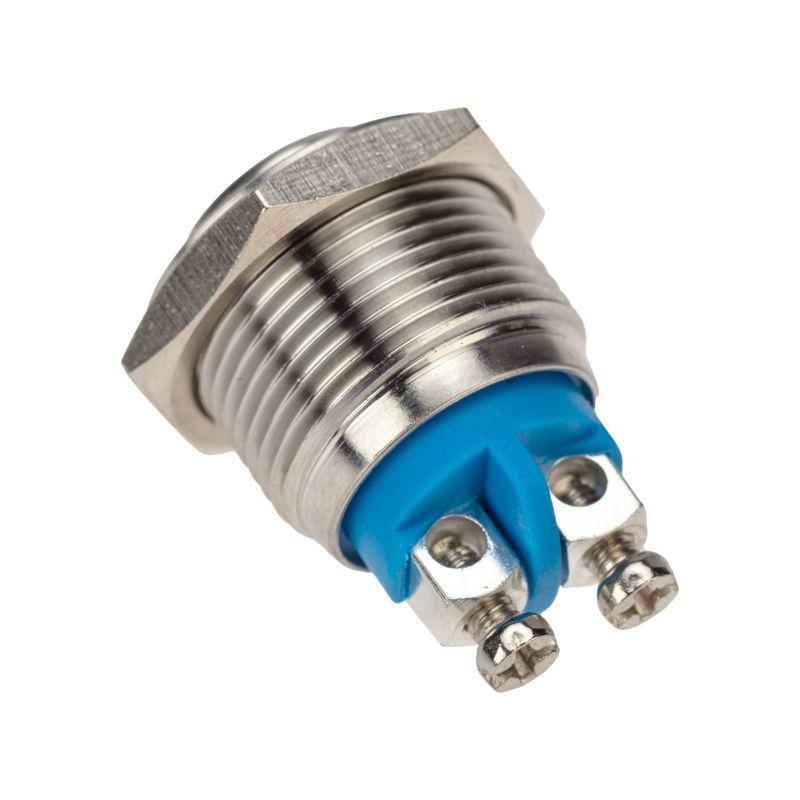Кнопка антивандальная O16 Б/Фикс (2с винт) OFF-(ON) выпуклая REXANT предназначена для коммутации электрических цепей напряжением 250В путем включения-выключения питающего провода. Такие кнопки применяются в местах, где существует большой риск их повреждения (на различных производственных линиях, в лифтовых кабинах, около входной двери и т.д.). Главными отличительными особенностями антивандальной кнопки являются металлическое исполнение и неуязвимость контактной группы, что обеспечит ей долговечное функционирование. Изделие состоит из двух основных частей - лицевой части (головки) и контактной, и имеет пружинный возвратный механизм. Монтаж осуществляется без применения винтов на плоских панелях толщиной от 0.5мм до 3мм. Подключение проводов осуществляется с помощью винтовых зажимов. Основные характеристики: Номинальное напряжение и ток: 3A/36V(DC) 3A/250V(AC); Тип переключения: OFF-(ON); Количество контактных групп: 1; Количество контактов в контактной группе: 2; Фиксация положений: отсутствует; Индикатор коммутационных положений: отсутсвует; Установочный диаметр: 16мм; Рабочая температура: от -25? до +85?; Степень защиты (IP): IP65; Ресурс: 10 000 циклов. Преимуществами использования данного изделия является надежность, быстрота и удобство монтажа.