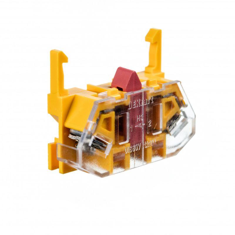 Контакт дополнительный серии ДК-22 Dekraft; предназначен для кнопочных выключателей серий ВК-22, ВК-30 и переключателей серий ПЕ-22, ПЕ-30; исполнение – 1НЗ; цвет – красный. Контакт устанавливается на управляющий элемент с правой или с левой стороны. При установке нечетного количества дополнительных контактов на управляющий элемент с индикацией необходимо использовать адаптер АД22-А и соединитель АД22-С. При установке четного количества контактов используются только соединители АД22-С.