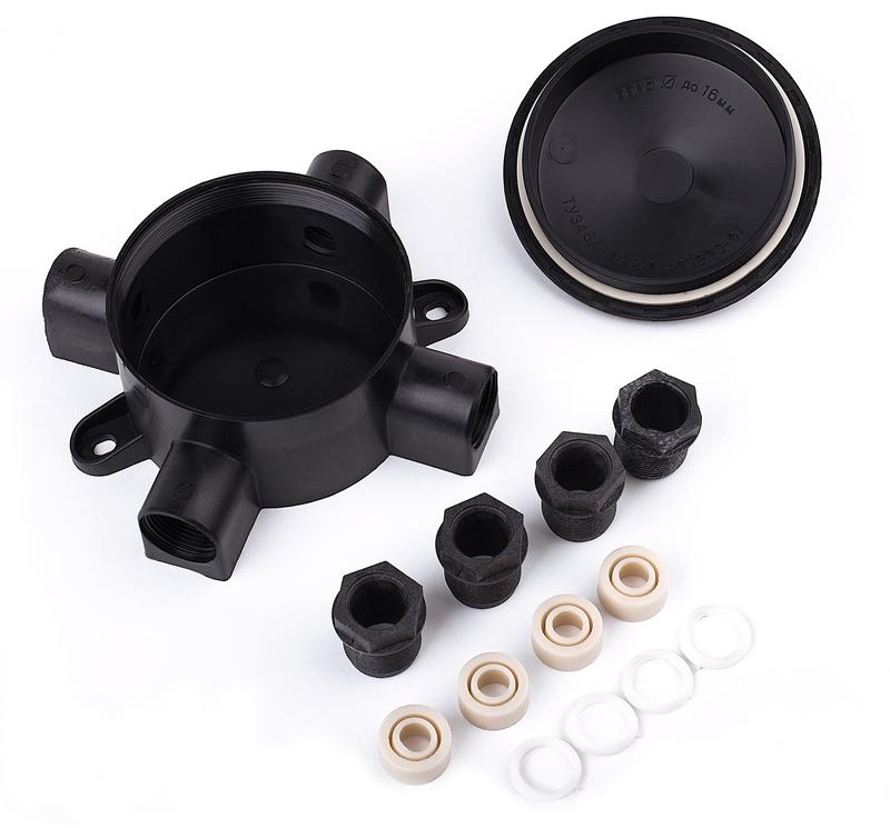 Предназначена для осуществления ответвлений и соединений кабелей круглого сечения наружным диаметром до 16 мм, а также двужильных кабелей плоской формы, прокладываемых открыто в осветительных сетях. Коробка состоит из корпуса и крышки, соединяемых на резьбе. Корпус имеет 4 сальниковых ответвления с внутренней резьбой, в которые ввёртываются пластмассовые гайки. Для уплотнения под крышкой и в сальниковых ответвлениях проложены мягкие уплотнительные кольца.