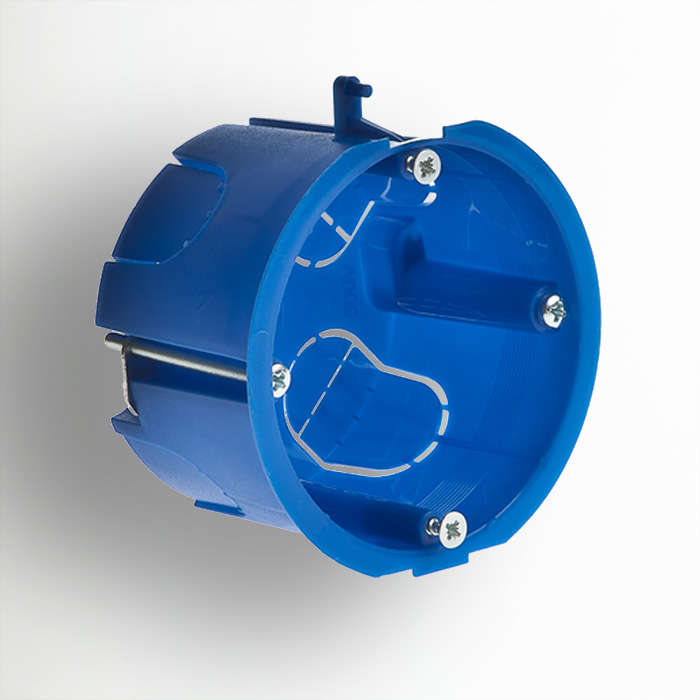 Коробка уст. СП 65х40 для гипсокарт. с метал. лапками Рувинил 10172 – аксессуар электрооборудования. Монтажная коробка круглой формы, глубиной 40 мм, изготовлена из пластика, ярко-синего цвета. Без крышки. Одномодульный. Фиксируется посредством распорных лапок. Для открытого монтажа электроустановочных изделий (выключатель, розетка и др.).