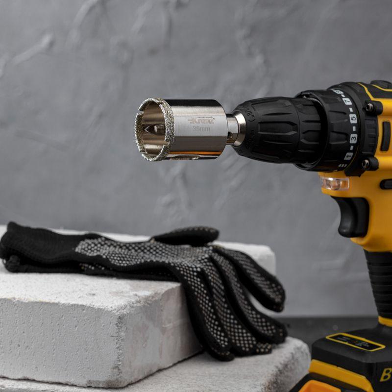 Алмазная коронка диаметром 35 мм используется при сверлении керамогранита, керамики, стекла. Наличие центровочного сверла обеспечивает точное позиционирование коронки на поверхности и помогает избежать смещения во время работ. Покрытие алмазной коронки выполнено гальваническим способом в два слоя, что обеспечивает эффективное сверление и продолжительный рабочий ресурс инструмента. Равномерное распределение алмазов по режущей кромке гарантирует аккуратное сверление материала без трещин и сколов. Высота алмазного слоя в 6 мм обеспечивает высокую производительность, а трехгранный хвостовик – надежную фиксации в патроне. При использовании алмазных коронок для сверления отверстий необходимо охлаждение, которое достигается путем подачи воды в рабочую зону.