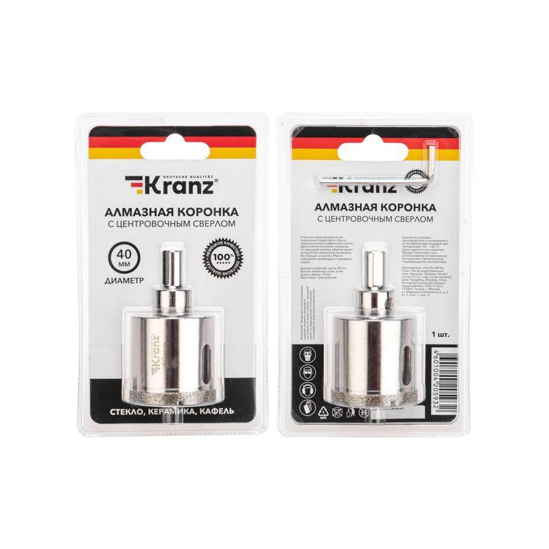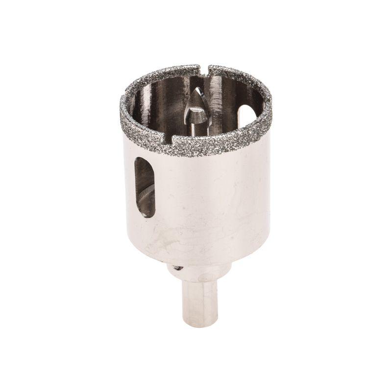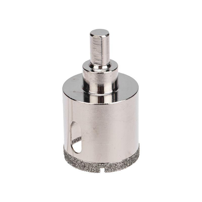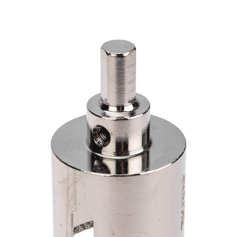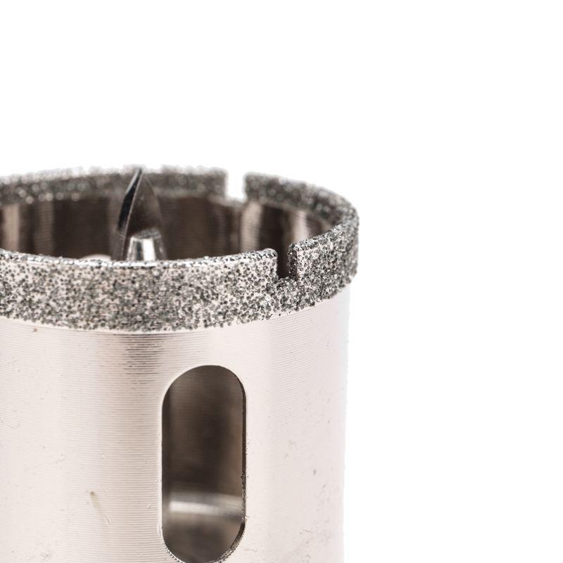 Алмазная коронка диаметром 40 мм используется при сверлении керамогранита, керамики, стекла. Наличие центровочного сверла обеспечивает точное позиционирование коронки на поверхности и помогает избежать смещения во время работ. Покрытие алмазной коронки выполнено гальваническим способом в два слоя, что обеспечивает эффективное сверление и продолжительный рабочий ресурс инструмента. Равномерное распределение алмазов по режущей кромке гарантирует аккуратное сверление материала без трещин и сколов. Высота алмазного слоя в 6 мм обеспечивает высокую производительность, а трехгранный хвостовик – надежную фиксации в патроне. При использовании алмазных коронок для сверления отверстий необходимо охлаждение, которое достигается путем подачи воды в рабочую зону.