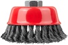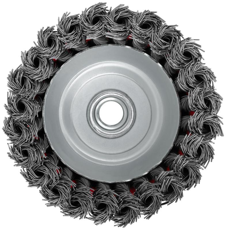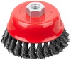 Корщетка-насадка для УШМ FIT IT типа ‘’чашка’’ предназначена для грубой обработки дерева и металла, снятия краски. Форма «чашка» обеспечивает хорошую площадь прилегания к поверхности. Стальная витая проволока обеспечивает высокую скорость и эффективность работы. Гайка с резьбой М14 обеспечивает прочную фиксацию на УШМ.